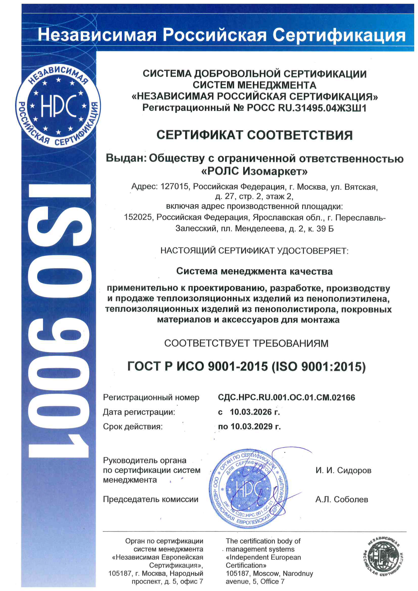 The quality management system of the company conforms to the GOST R ISO 9001 - 2015 (ISO 9001:2015)